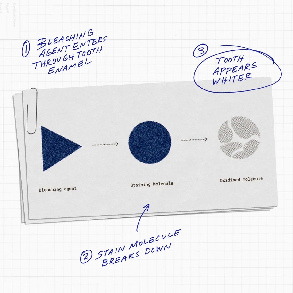 Teeth whitening through chemical bleaching oxidises stains and alters the molecules that are responsible for holding colour. Simply put, the bleaching agents enter through the enamel of teeth and break down these molecules into smaller, simpler forms. The smaller the molecule, the lighter in colour, resulting in an overall whiter appearance of the tooth.