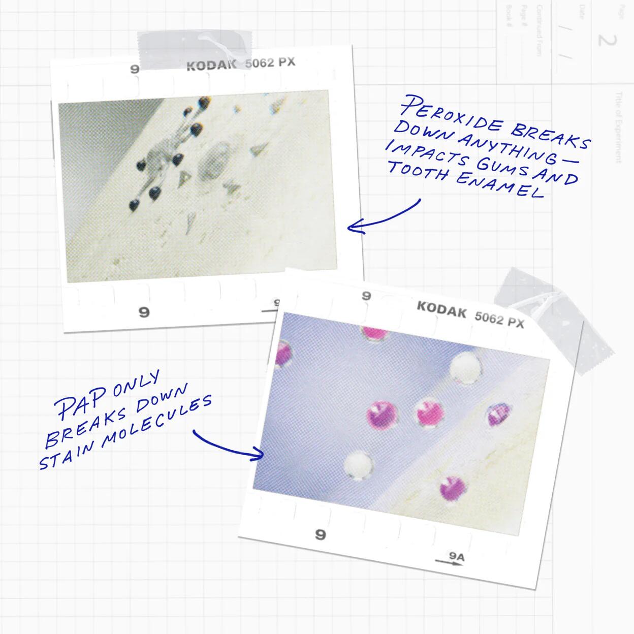 PAP similarly reacts with tooth stains, only without the release of free radicals. This means that the molecules responsible for discolouration are broken down safely, without any risk of sensitivity or pain.